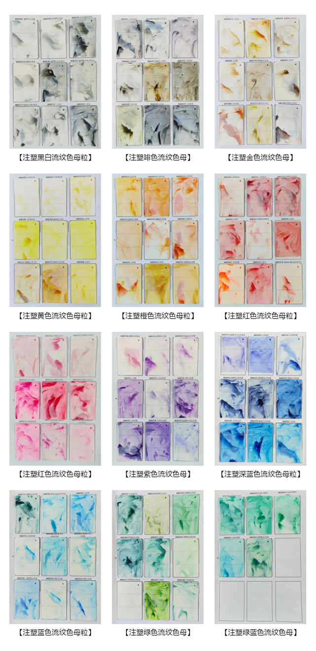 流纹色母仿大理石纹色母采用高相容性的材料,利用色母与原料之间的不同熔点和流动率,而产生自然的不规则条纹。客户可以根据需要采用不同色彩色母搭配出更为精彩的颜色效果。